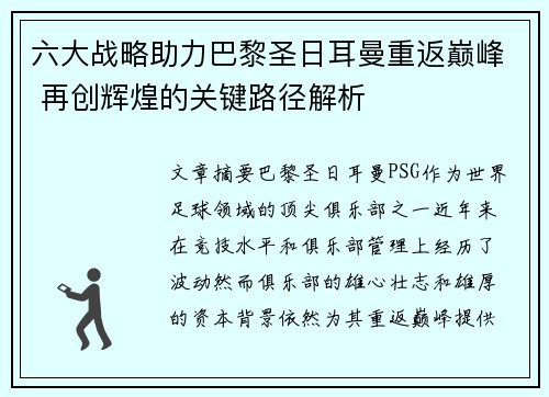 巴黎圣日耳曼(PSG)作为世界足球领域的顶尖俱乐部之一,近年来在竞技水平和俱乐部管理上经历了波动。然而,俱乐部的雄心壮志和雄厚的资本背景依然为其重返巅峰提供了有力支持。本文将从六大战略出发,详细分析如何助力巴黎圣日耳曼重返巅峰,并再创辉煌。首先,我们将探讨球队战略定位的重要性,如何通过全方位的市场定位与品牌塑造为俱乐部带来更大的商业价值;其次,分析战术打法的创新与球队配合的提升,如何通过现代化的足球理念提升球队的竞技表现;再者,阐述如何通过优秀的球员引进和青训体系的建设,完善球队的阵容深度,确保长期的竞争力;最后,探讨管理层和财务策略在推动俱乐部发展中的核心作用,特别是在全球化竞争格局下如何提升俱乐部的整体运营效能。通过这六大战略,巴黎圣日耳曼有望在未来的赛季中突破瓶颈,再度走向巅峰,书写属于自己的辉煌篇章。